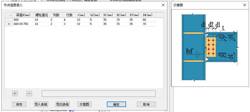 录入界面如图1.5所示,支持录入各节点螺栓及几何信息,参数含义见示意图,梁高支持直接录入数值以及录入范围值,录入后会按照对应参数创建节点。
