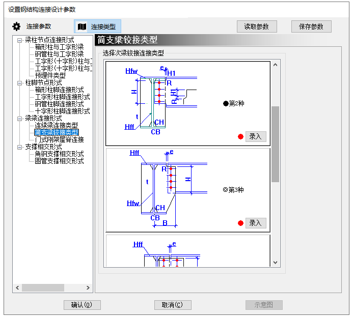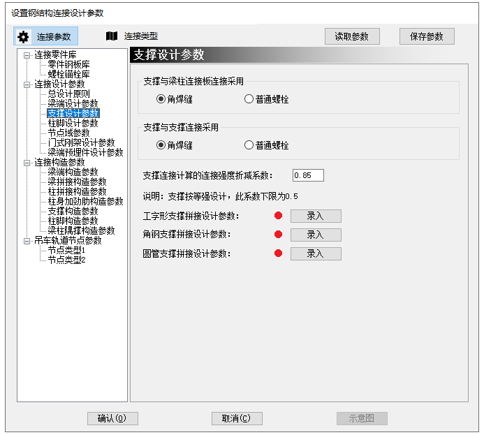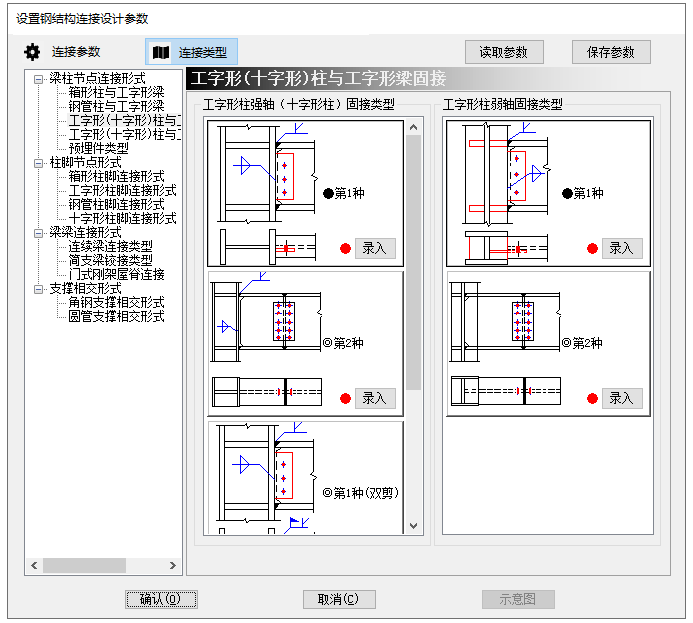 现阶段对于工字型梁与工字型柱连接节点,圆管、角钢、工字型支撑与梁柱连接以及主次梁铰接连接节点可以进行连接信息录入,勾选后,在工字型梁与工字形柱连接类型界面及支撑设计参数界面会弹出录入信息按钮,红色表示未进行录入,绿色表示录入完毕,未录入的节点将执行默认设计方式。如图1.2、图1.3、图1.4所示。