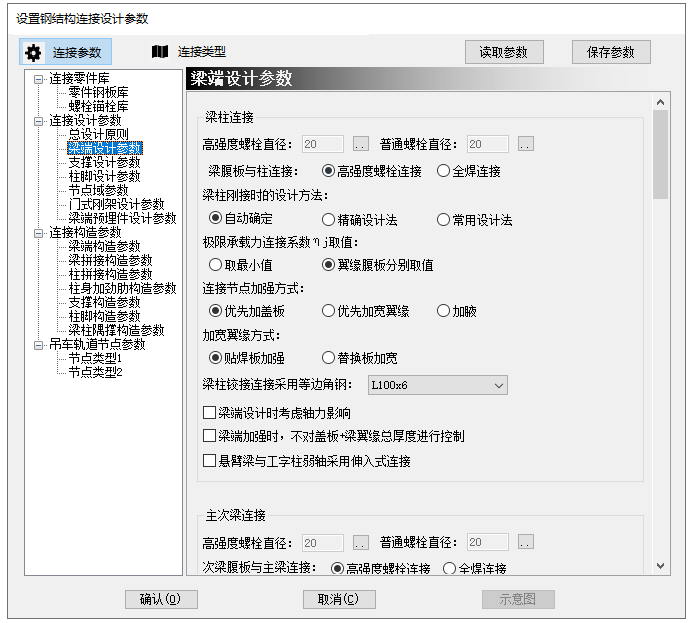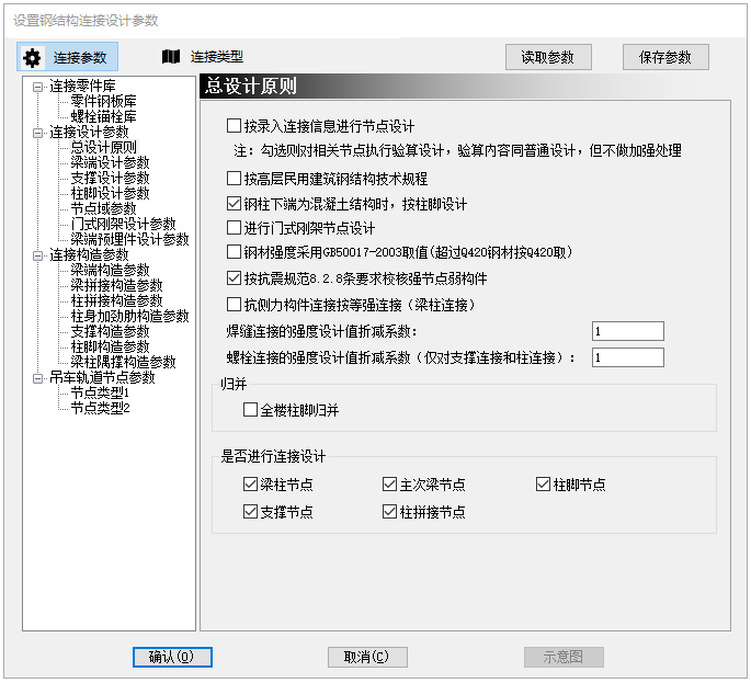 钢结构连接设计参数:总设计原则中,增加“按照录入连接信息进行节点设计”选项。勾选后,节点相关信息按照录入参数创建节点,按照设计内力进行验算,不做加强处理。参数位置如图1.1所示。