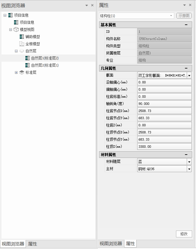 软件界面的中部左侧区域可切换显示为项目浏览器或属性栏(图1.5)。建立模型或导入模型后,项目浏览器中将显示自然层与标准层间的对应关系及相应楼层信息,并且出图后,项目浏览器中将显示“施工图纸”,“三板施工图纸”列表。双击项目浏览器内选项可切换楼层或切换图纸。在模型中选择结构构件后,可通过点击鼠标右键后点击“属性”选项的方式,查看该结构构件的属性,包括构件类型、截面信息、几何定位及是否预制等。由于预制构件信息量较大,故相应内容暂不在属性栏内显示。