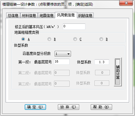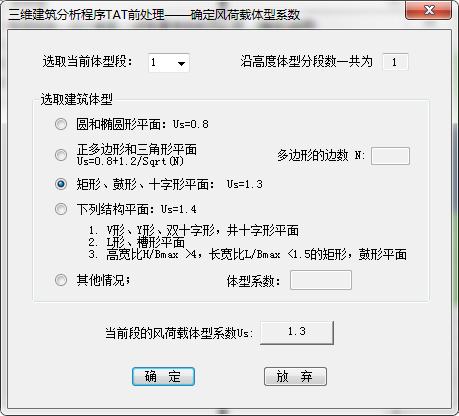 沿高度体型分段数:现代多、高层结构立面变化比较大,不同的区段内的体型系数可能不一样,程序限定体型系数最多可分三段取值。