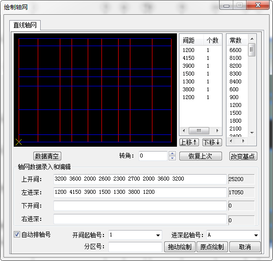 右侧列表框显示当前开间或进深的数据和轴网的常用数据。