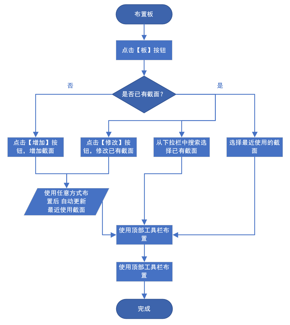 布置板的整体流程如图2.31所示。首先在板布置栏中选择希望被布置的截面,设置错层值参数和材料强度参数后,再使用模型操作视图区顶部的工具条中的布置方式进行布置。请注意:板仅可在由梁或墙围成的闭合区域内生成。