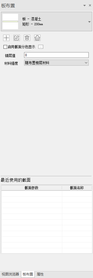 在板布置栏顶部,是板截面下拉栏。该下拉栏中显示当前正在被布置的板截面信息,包括材料类别、截面类型、截面尺寸和截面名称(若有)。点击该区域可激活截面下拉栏,其中显示该项目所有楼层中的板截面。用户可在该下拉栏中选择希望被布置的板截面。