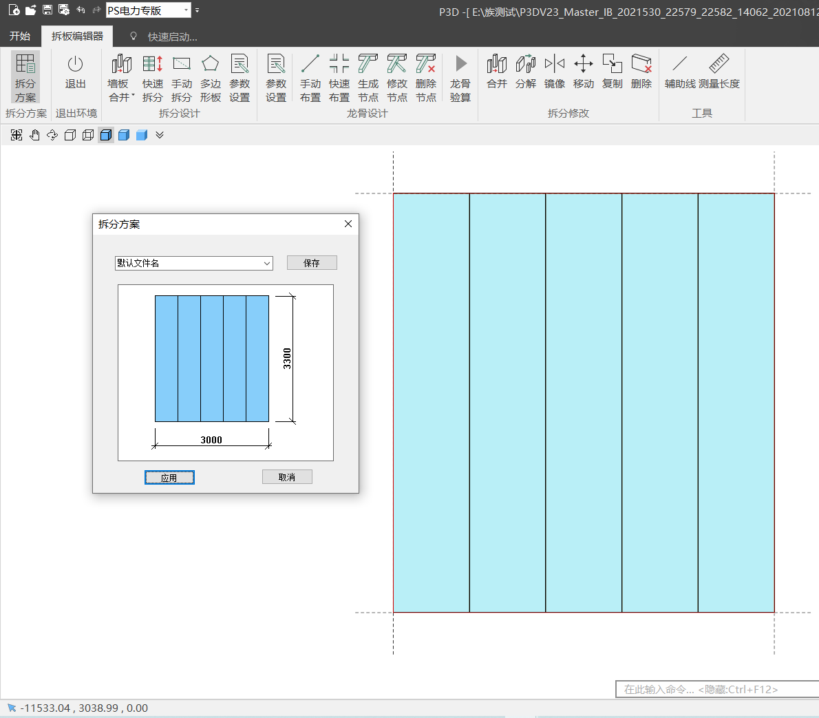 未拆分的墙板形状在编辑器中以绿色显示。如果选择了多块未拆分的墙板,则墙板之间以红线分隔。如果处于修改模式,则自动导入已拆分的墙板,以蓝色(矩形墙板)或棕色(多边形墙板)显示。单击“拆分方案”,弹出对话框,可在此导入或保存一个拆分方案,如图 4.37所示。