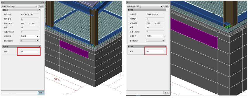 在三维视图可通过属性对话框对已拆分的墙板的法向偏移进行调整,如图 4.54所示,程序将自动调整相关的龙骨和墙角。