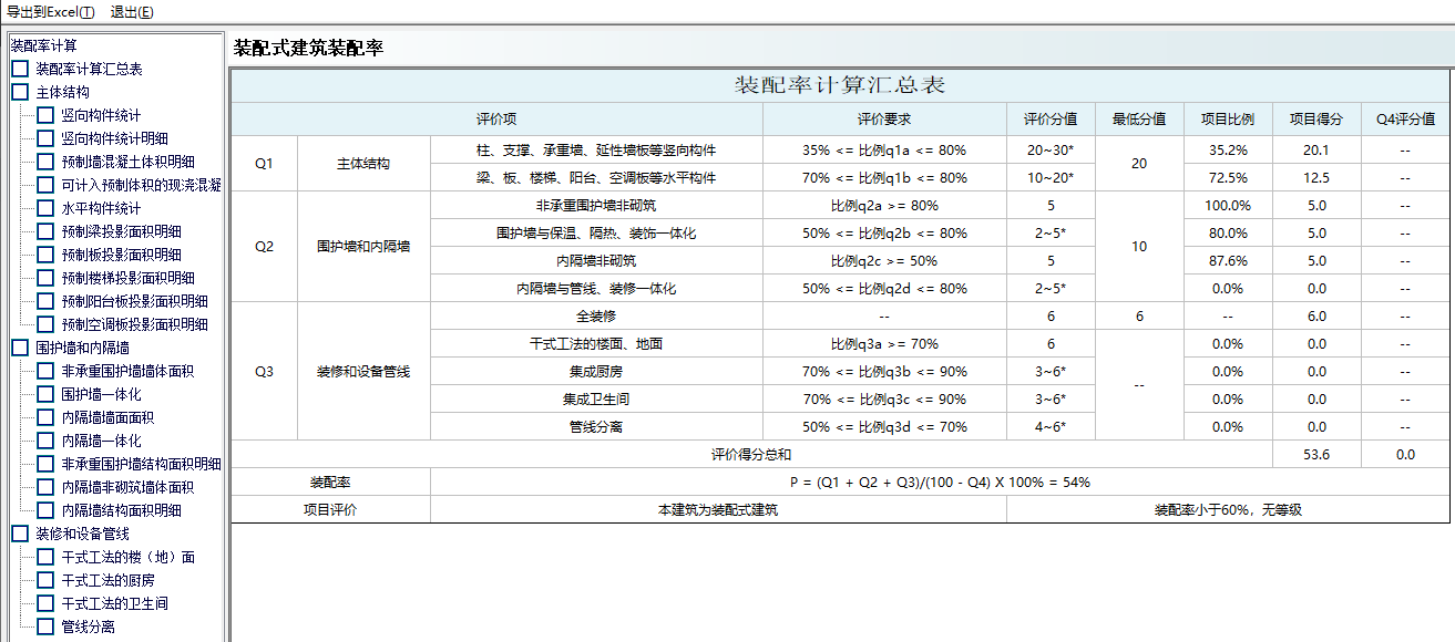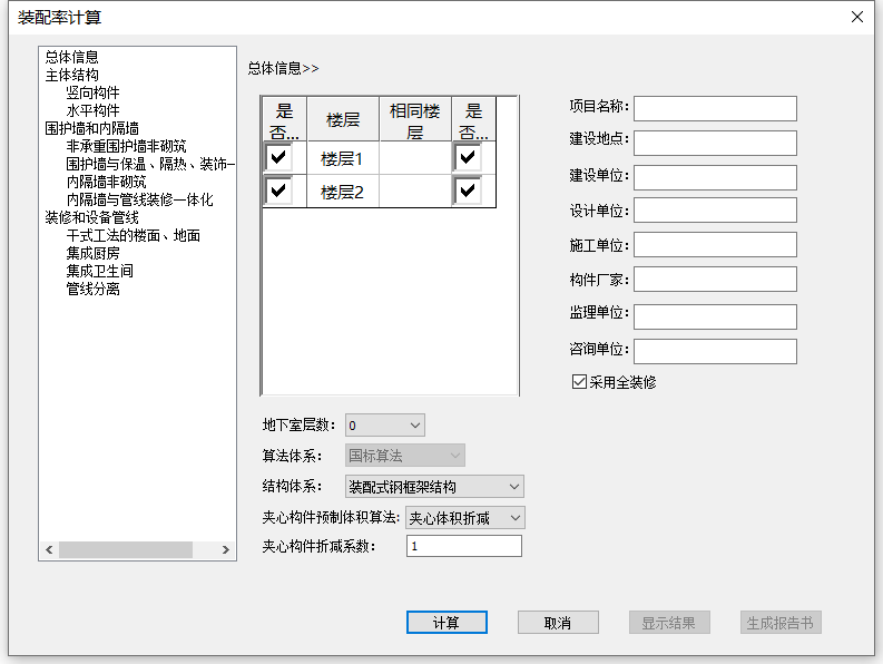 此模块提供国标装配率统计功能。单击“国标装配率”,弹出装配率计算对话框,如图 4.58所示,用户可对对话框左侧的总体信息及各评价项选项卡进行切换,进行相应的计算设置。在总体信息里,设置预制方案相同楼层,其他分项可直接继承,避免多次输入。当需要单独设置统计时,取消勾选即可。国标装配率提供自动获取地下室层数功能,默认地下室不进行统计。所有页面设置完成后点击“计算”,可直接弹出各项计算结果。也可点击“生成报告书”输出为装配率计算书word文档保存至电脑中,位置在模型所在路径的同名文件夹中。