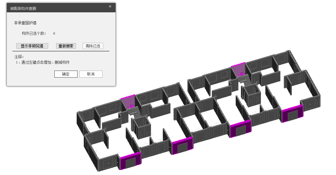 勾选自动计算,点击“指定围护墙”,程序会自动搜索到所有参与计算的非承重外围护构件并显红,在程序搜索自动结果的基础上,可通过单击构件增减参与计算的构件。若应参与计算的构件,程序未搜索到,则可通过手动单击增加,从而保证该项内容计算的准确性。左上角对话框构件已选个数实时更新选择构件的总数量。点击“确定”返回装配率设置界面,再进行计算。点击“取消”退出选择界面。计算墙体外表面积不扣除门、窗及预留洞口等面积。当模型中创建了砌筑墙体,分子项中不统计该类型墙体表面积。如图4.63所示。