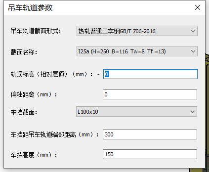 点击“吊车梁”,弹出吊车梁布置的参数定义对话框,定义吊车梁的截面,顶部距离层顶的标高,布置位置相对布置的偏移量,车挡截面,车档位置参数,如图5.2所示,设置好以后,可以在对应自然层进行吊车梁的补充建模,注意,吊车梁的补充建模要在节点设计之前进行。