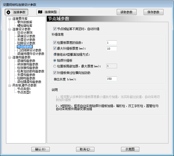 柱腹板最大加厚厚度,控制H型截面采用局部加厚的补强方式,当局部加厚超过给定值后程序自动按贴焊补强板处理。