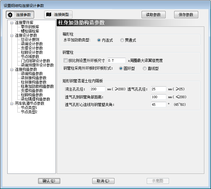 柱身加劲肋构造参数输入的是梁柱连接时加劲肋的设置方式,以及矩形钢管混凝土柱的内隔板形状,如图5.17所示。