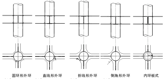 对于钢管截面的柱,柱加劲肋设置方式有外环板式与内环板式两种。外环板式根据外环板采用的形式又分:圆环形、直线形、折线形与倒角形。各加劲肋的连接方式如图5.18所示。