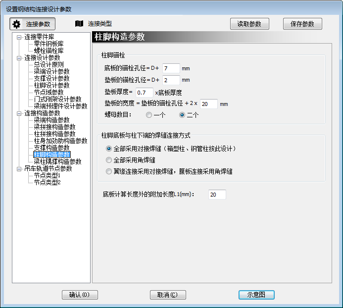 柱脚控制参数是在进行柱脚自动设计时的柱脚连接节点的各种参数,如图5.21所示。