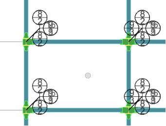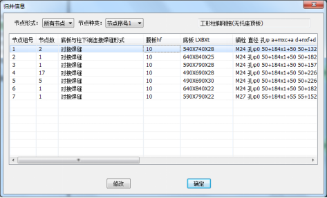点取节点表修改弹出连接归并信息界面如图5.38所示,表中列出了各连接归并号下的节点连接数量及对应的连接参数详细信息。点击“节点形式”下拉框可根据节点形式(梁柱节点、柱脚节点…)分类选择,点击“节点种类”下拉框可以选择当前节点形式下相应的节点种类,当前的节点种类在右侧的文字框内显示。列表中刷新为当前节点种类下的所有节点组信息。在视图界面可以显示每个节点周围的连接归并号信息,如图5.39所示。圆圈中下面的数字代表该连接的节点种类序号,上面的数字代表该组连接的节点组编号。在界面中点击“修改”弹出相应类型的连接修改对话框,设置完参数后点击确定,可对当前选中的某一行对应的所有节点连接进行批量修改。双击该行可以在视图中高亮显示当前节点组中所有的节点连接。