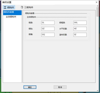 编号设置功能是设置包括主体钢构件、三板构件(龙骨、屋面檩条)的编号前缀,该前缀加上构件编号用于图纸上构件编号的显示。