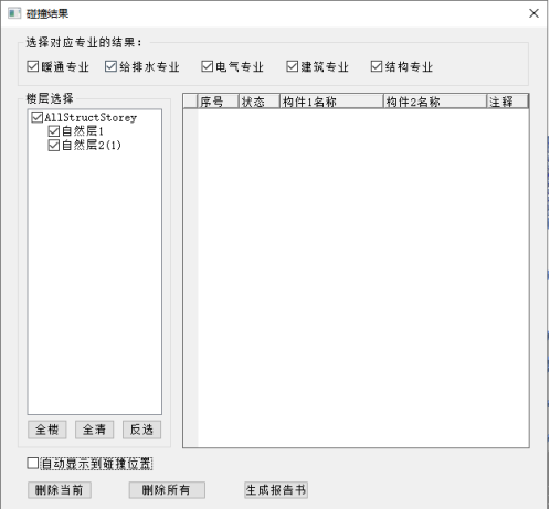 专业选择:全专业可选,列表只显示与选中专业构件相关的碰撞结果。