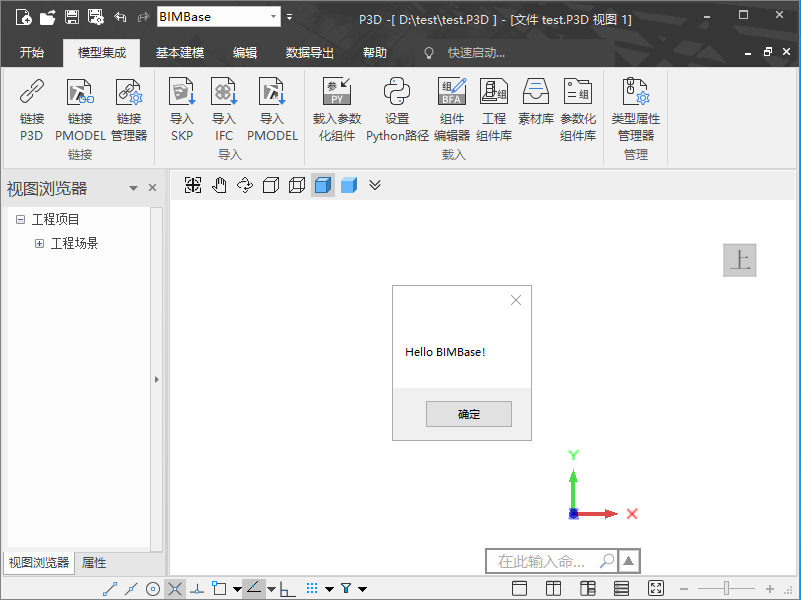 第二步:通过BIMBase平台的接口 BPToolsManager::registerFun, 将第一步中所创建的HelloBIMBase函数注册到相关平台,并将其与命令“HelloBIMBase”关联。此时,AutoDoRegisterFunctionsBegin和AutoDoRegisterFunctionsEnd两个宏之间的代码会在相关模块加载时执行,即模块加载时HelloBIMBase被注册到平台。此时,启动BIMBase,在命令行输入已经注册的命令“HelloBIMBase”,执行后将弹出HelloBIMBase弹窗,如图1-1所示。