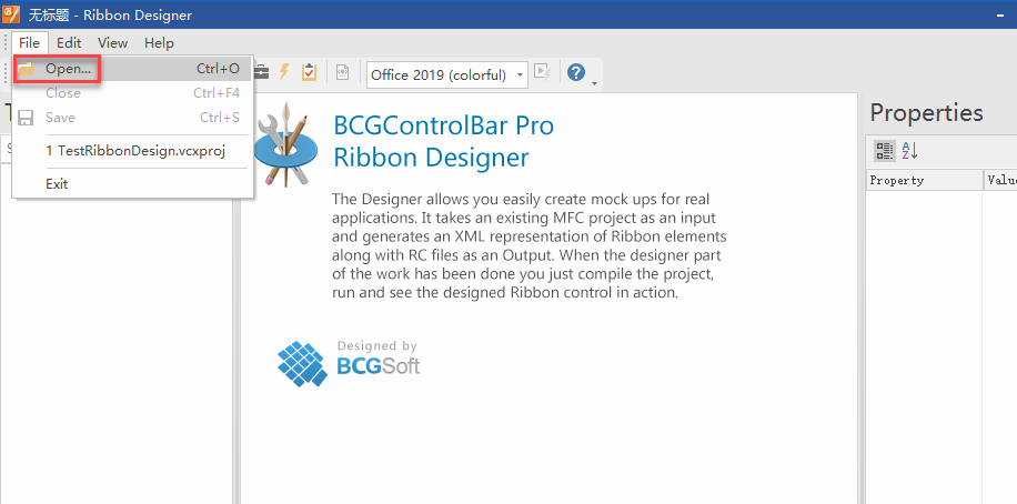 启动BCGRibbonDesigner.exe并选择打开TestRibbonDesign.vcproj。