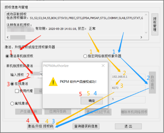 授权方式分为单机授权及网络授权两种,单机版按红色箭头,网络版按黄色或蓝色箭头。