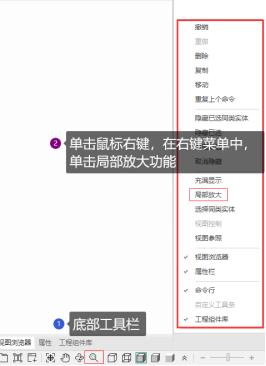 在底部工具栏中,单击“局部放大”功能按钮或在右键菜单中,单击“局部放大”功能,可激活命令。功能按钮位置,如图所示;