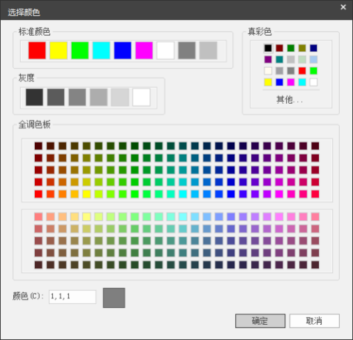 颜色:点击颜色面板,弹出<选择颜色>对话框,如图6.7-4所示。可通过鼠标左键点击选取颜色,选取颜色后同步显示RGB值或255色;此外,用户也可在颜色文本框中直接输入RGB值或225色,调色板会同步显示指定的颜色。退出<选择颜色>对话框后,颜色刻度会显示在选择的颜色相应的位置。