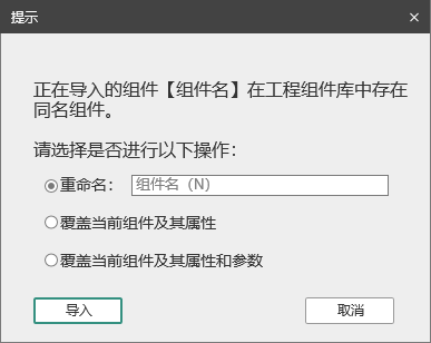 修改正在导入的组件的名称;覆盖当前组件及其属性:覆盖当前组件的几何,导入完成后的组件的类型取两个组件的并集,用正在导入的组件的属性字段覆盖原组件的属性字段,但是不覆盖属性值;