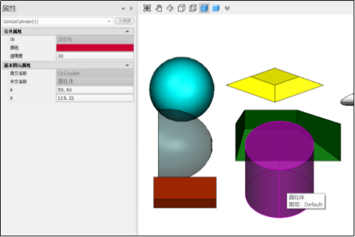 对于所有基本图元而言,都有共同的ID、颜色和透明度,在公共属性中显示。其中,ID为创建图元时软件自行分配,不可更改,而颜色和透明度均可以在属性表中进行自定义设置,其中透明度取值范围在0-100区间,0代表完全不透明,100代表完全透明,如图所示: