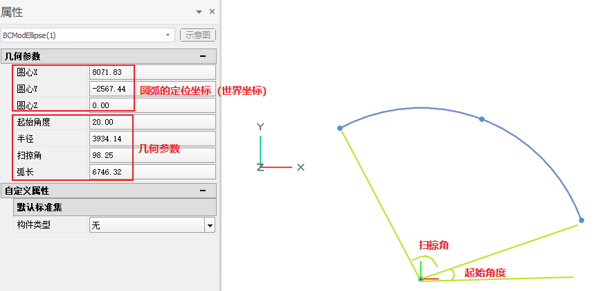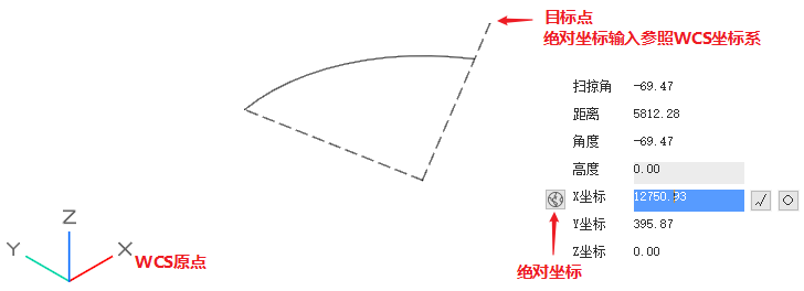 - 定位坐标表示的是圆弧实体坐标系原点在WCS坐标系下的坐标定位。