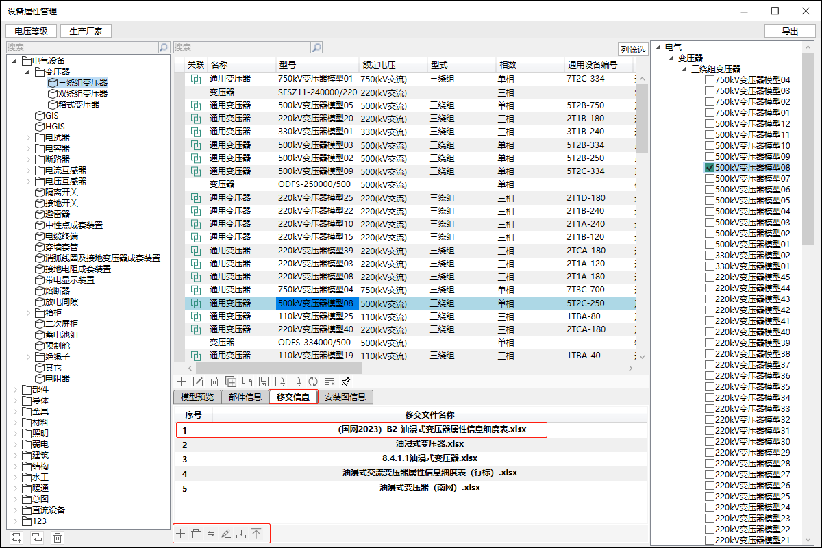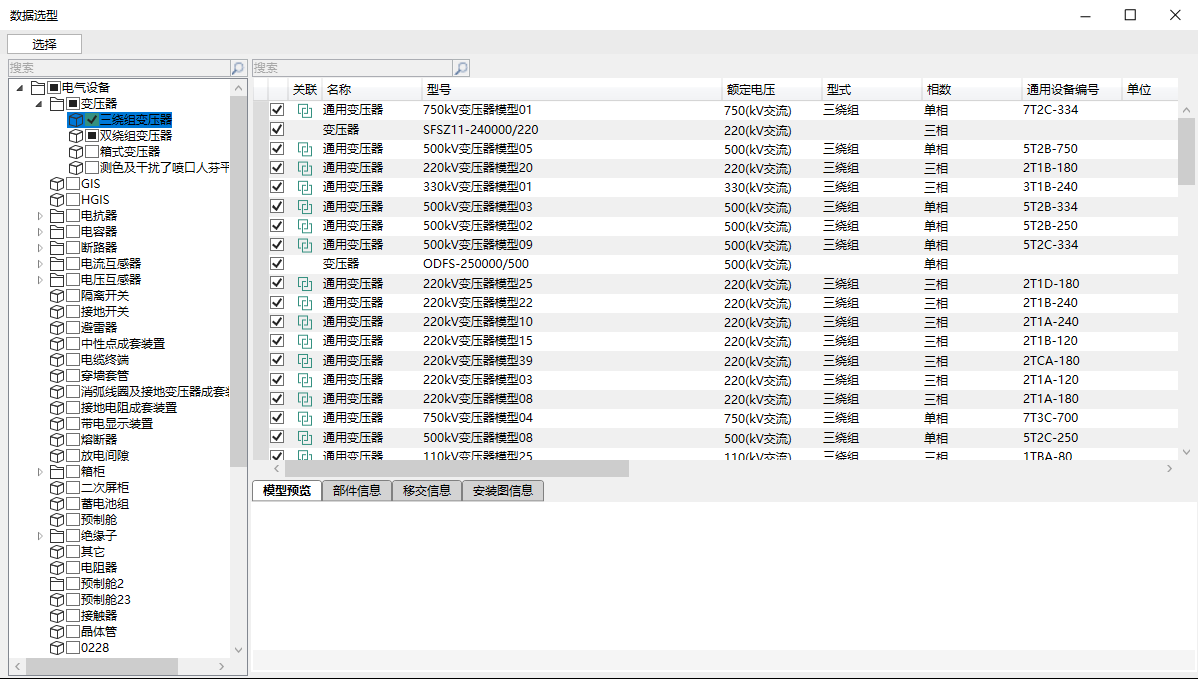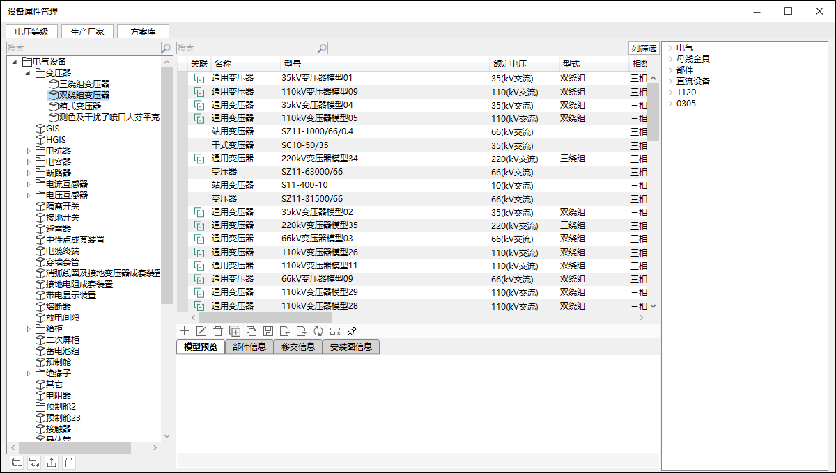 设备属性库用来存储设备、型材、导体、金具、水暖材料等类别的属性信息,如设备的名称、型号、电压等级,设备属性可与三维模型进行关联,在模型布置时,可直接赋予所关联的属性数据。