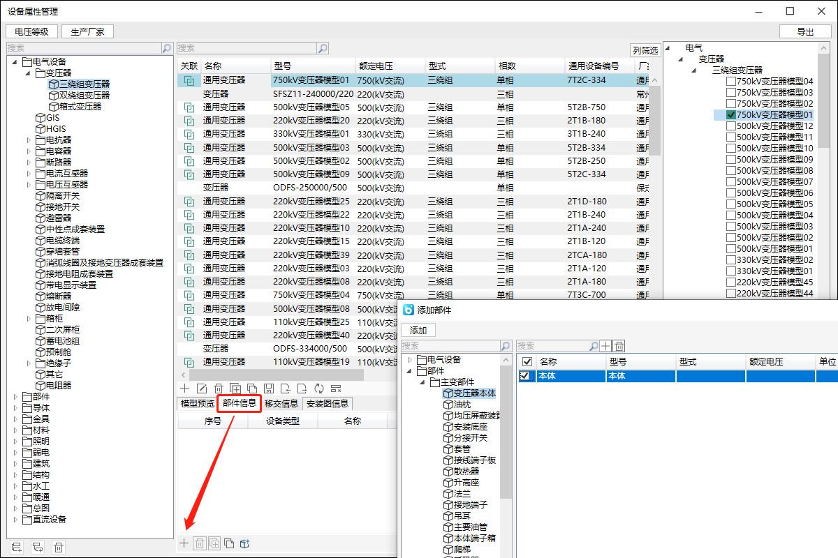 当所选的设备含有子设备时,需在部件信息中给主体设备添加各个子设备的信息,当此条数据关联的族模型导出成GIM文件时,关联的子设备信息也会被导出。