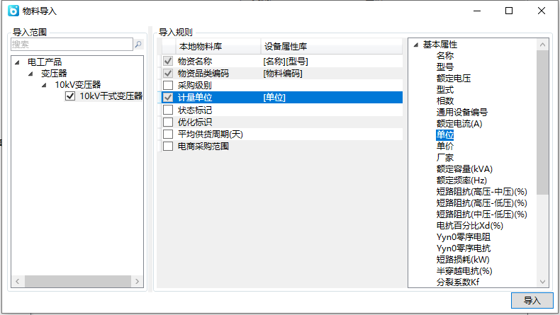【物料导入】对接物资品类库功能,将物资品类库内容批量导入到当前设备属性库(注:本功能目前适用于南网公司)