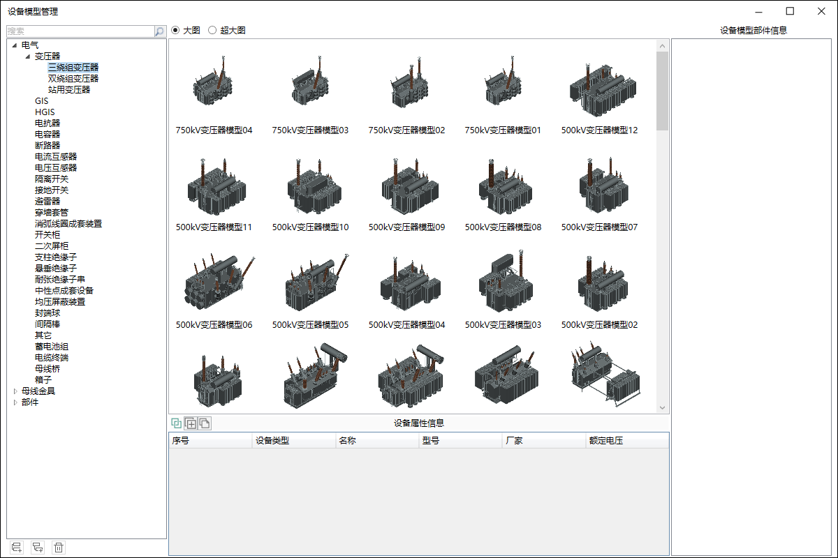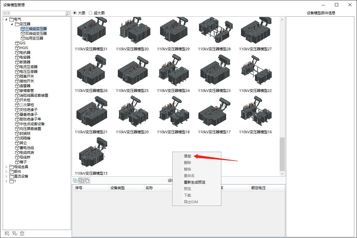 3)模型入库:点击对应的模型节点,组件模型录入对应的节点,空白处右键点击添加,选择BFA模型文件,上传到模型库中;随后与设备属性库节点关联对应上改模型,即可正常布置使用了。