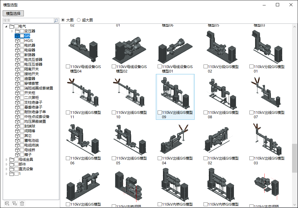 (1)模型选择:用于从公共库中选择当前工程中需要用到的设备模型;打开界面后可勾选左侧节点树,亦可勾选右侧设备列表;