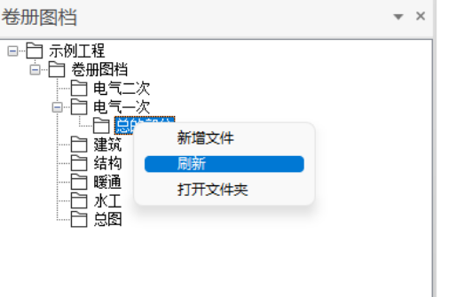 (2)卷册目录右键,弹出编辑功能,可新增文件、刷新节点、打开文件夹。