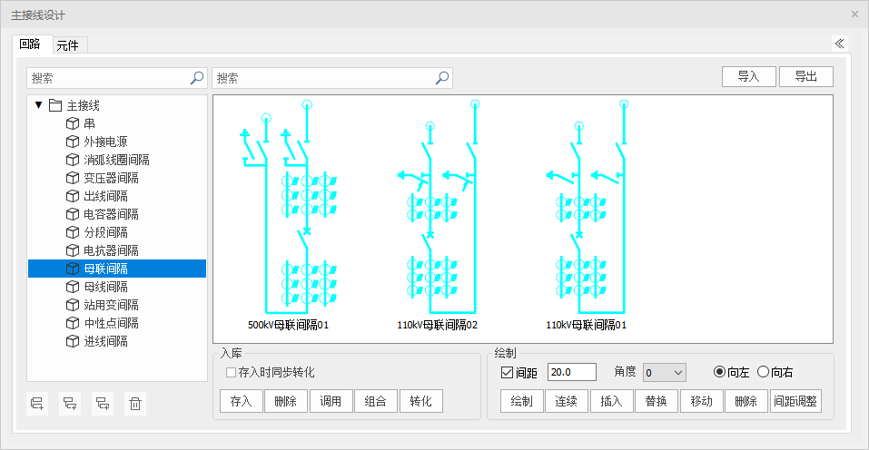 (3-10)设备元件图例符号入库后,可以设定元件绘制角度,通过“绘制”功能直接绘制设备元件图例符号来拼接间隔回路(在下面的间隔图例库扩充中进一步讲解),也可以对已绘制间隔回路中的设备元件图例符号进行替换操作;