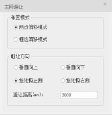 (1)在防雷接地菜单栏下,点击“接地网避让”功能按钮,激活命令,视口弹出以下对话框,设定布置模式、避让方向以及避让距离;