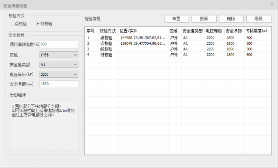 可通过布置点或者选择线的形式显示查看安全净距范围,从而判断是否满足安全净距要求。
