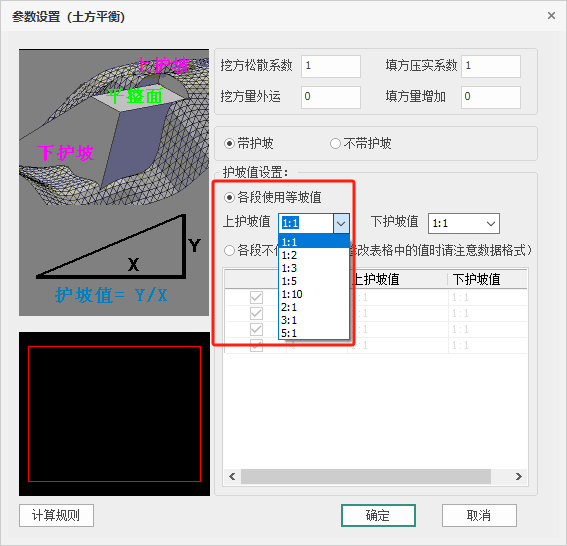 平衡范围的各段边的护坡分为上护坡值和下护坡值,各段的上或下护坡值一致,可统一设置。