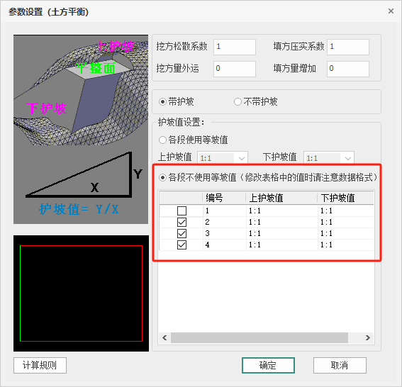 平衡范围的各段边的上或下护坡值可不一致,每段的上下护坡值可单独设置。