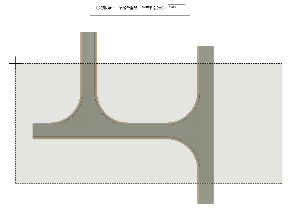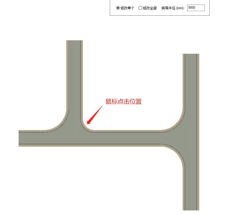 (2)在弹出的界面中,设定接头的转弯半径;选择单个修改时,左键点击道路接头对应位置即可修改转弯半径;支持分别修改不同位置的转弯半径。