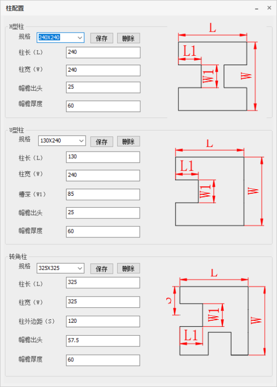 在界面中设定H型、U型、转角柱的参数及规格名称,通过【保存/删除】按钮实现下拉选项的保存和删除。