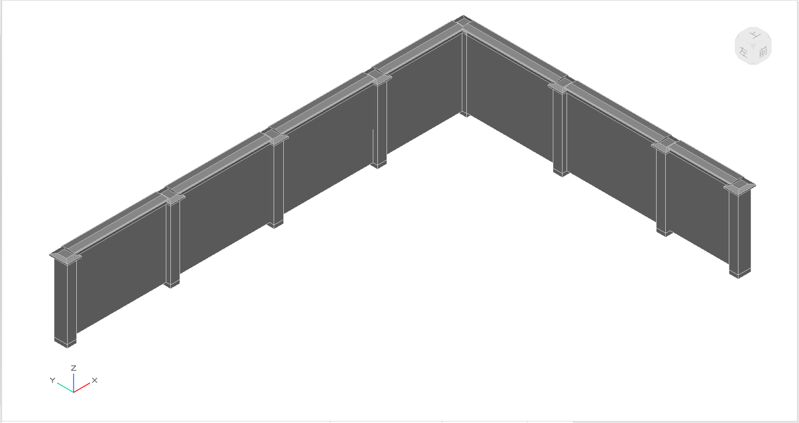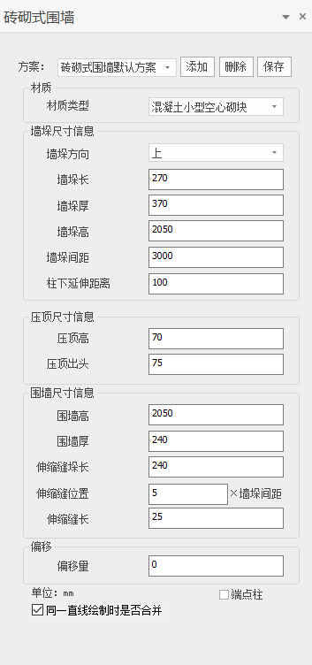 通过输入,设定围墙高、厚、伸缩缝位置、伸缩缝位置的墙垛长及伸缩缝的长度等参数。
