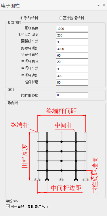 复选框可设定在绘制过程中,同一直线上点击多个点时,围栏是否自动合并。