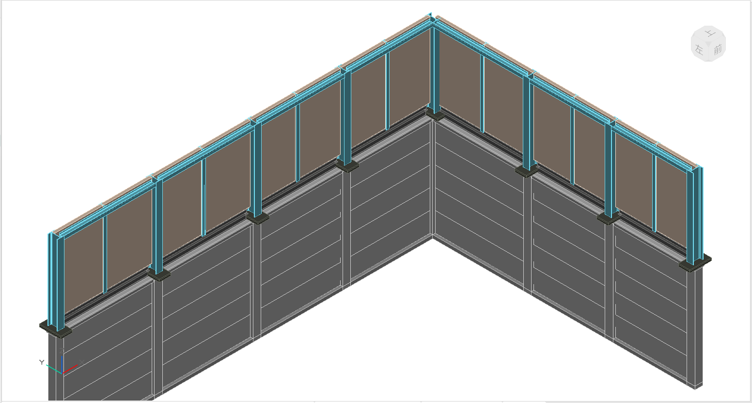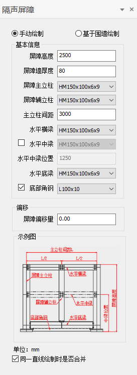 (2)隔声屏障分为手动绘制和基于围墙绘制两种方式。在左侧的界面中,设定屏障参数,手动绘制时,在模型中的目标位置按提示进行布置操作。基于围墙绘制时,选择图面中已布置的装配式围墙或砖砌式围墙模型,进而选择屏障的朝向,软件自动识别围墙的墙柱,在墙柱顶部生成隔声屏障模型。
