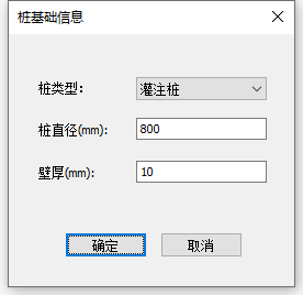 在柱截面栏下方是对截面的管理功能,从左至右分别是新建、修改、删除和清理。点击新建按钮后,将弹出新建桩基础截面对话框,如图所示。可在该对话框中选择桩基础截面类型、输入截面数值参数参数,点击确认后即可新建截面。