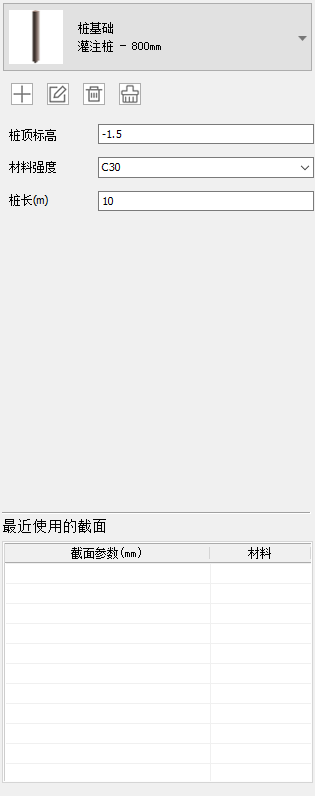 该功能允许创建并管理多种类型的桩基础截面,依据用户输入的定位和材料信息,以指定的方式便捷地布置桩基础。提供了最近使用截面、自由布置功能,提升了建模效率。该功能由基础布置栏和顶部工具条组成,如图所示。