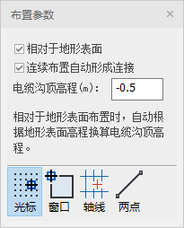 布置电缆沟时,可以设置电缆沟的标高,勾选相对于地形表面布置时,沟顶的高程一般输入负值,不勾选时,直接输入高程。布置完成的电缆沟还可以拖拽夹点调整长度。