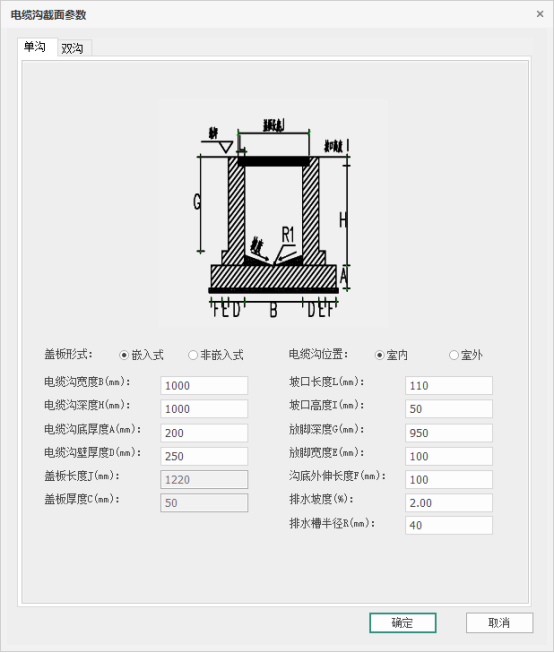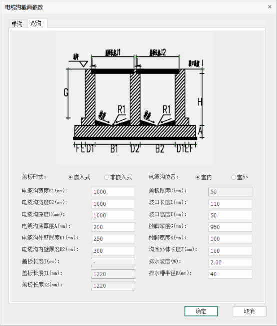 盖板形式:指定电缆沟盖板部分的形式,目前提供盖板内嵌电缆沟内部,以及盖在电缆沟顶部两种形式。