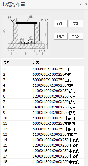 点击【预制】可以将软件预存的电缆沟截面添加到对话框中。