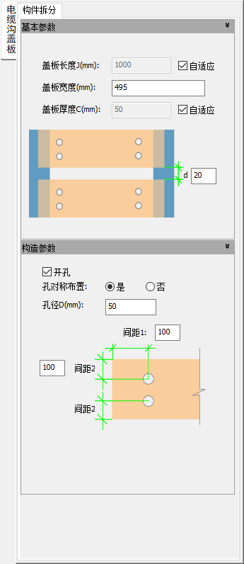 开孔:设定是否在电缆沟盖板上开孔。不开孔时,下方的孔径及间距等参数灰化不可用。